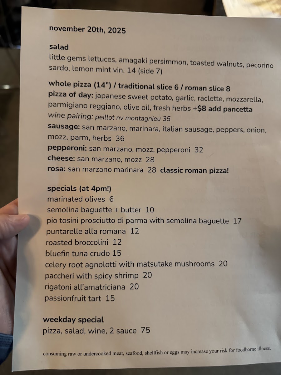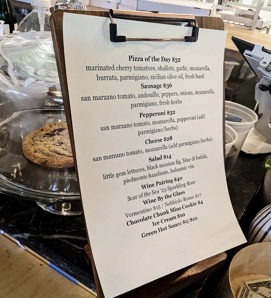 The menu highlights include unique choices like the Broccoli and Cheddar Pizza or the vibrant Green Sauce, alongside classics such as Pepperoni Pizza and a Vegan Mushroom option. Light salads and housemade pasta dishes also complement the selection, while drinks range from a smooth Matcha Latte to thoughtfully chosen wines that enhance the flavors on your plate.