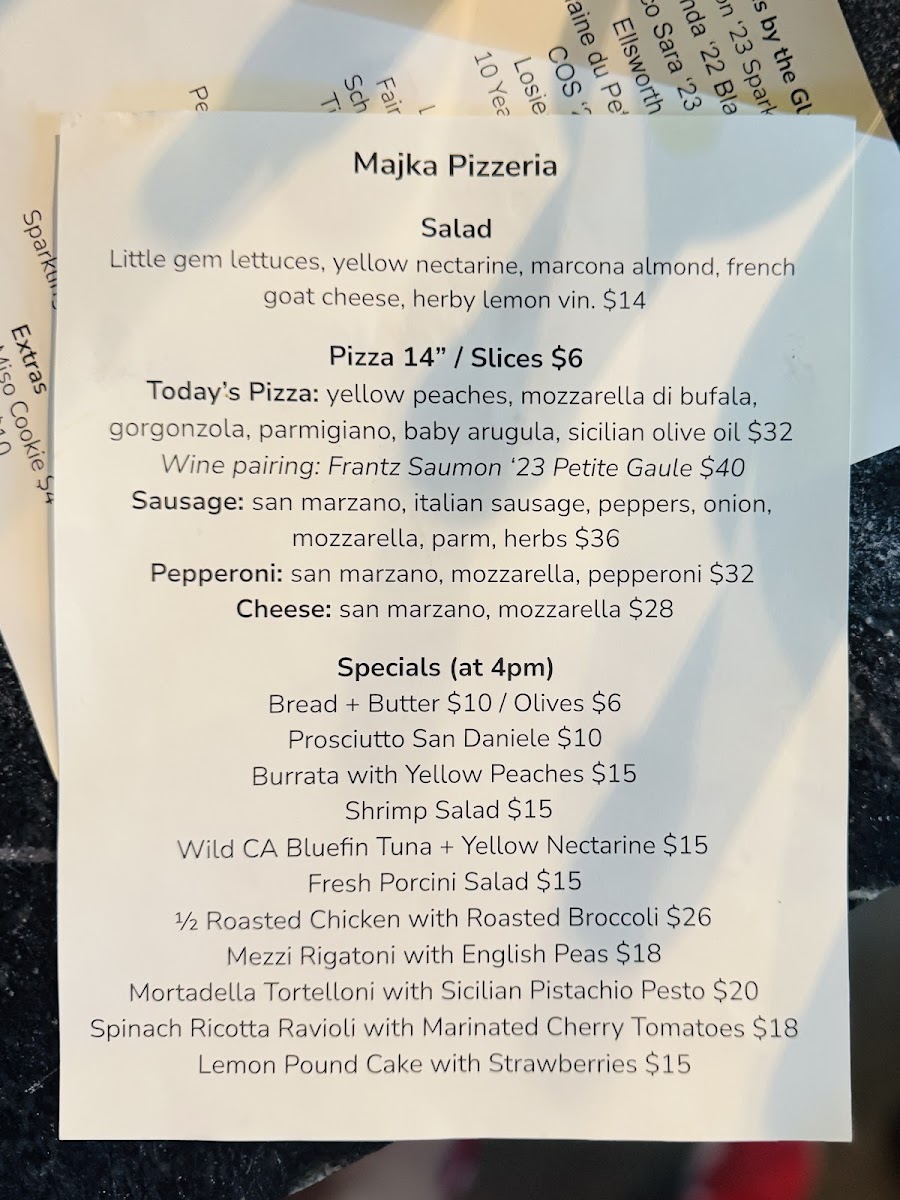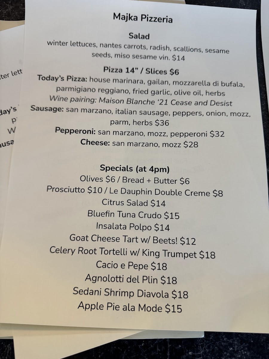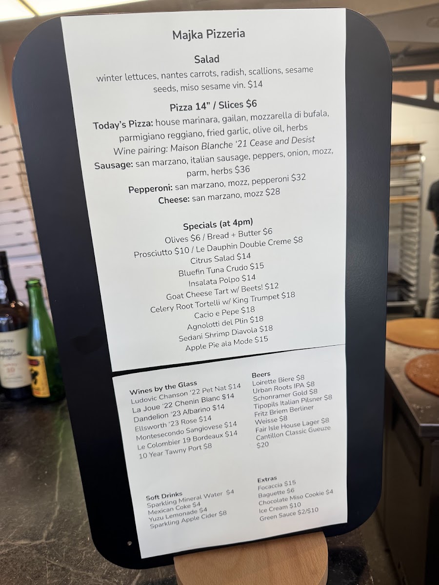 Majka Pizzeria offers a thoughtfully simple menu that focuses on quality and seasonal ingredients, reflecting a comfortable yet refined dining experience. Guests can expect a well-curated selection of pizzas alongside small plates and carefully paired wines, perfect for a relaxed lunch or an unhurried dinner.